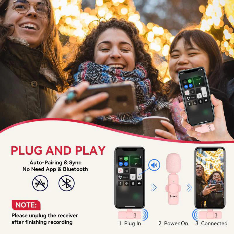 Auto Pairing, Easy to Use: The wireless clip-on mic kit is easy to use, simple to set up, and plug &play. No Bluetooth/ extra adapters/ applications needed. Just plug the receiver into iPhone or iPad, turn on the 2 transmitters, then start recording. The mini mic kit could be used in most social applications and meet the needs of content creators.