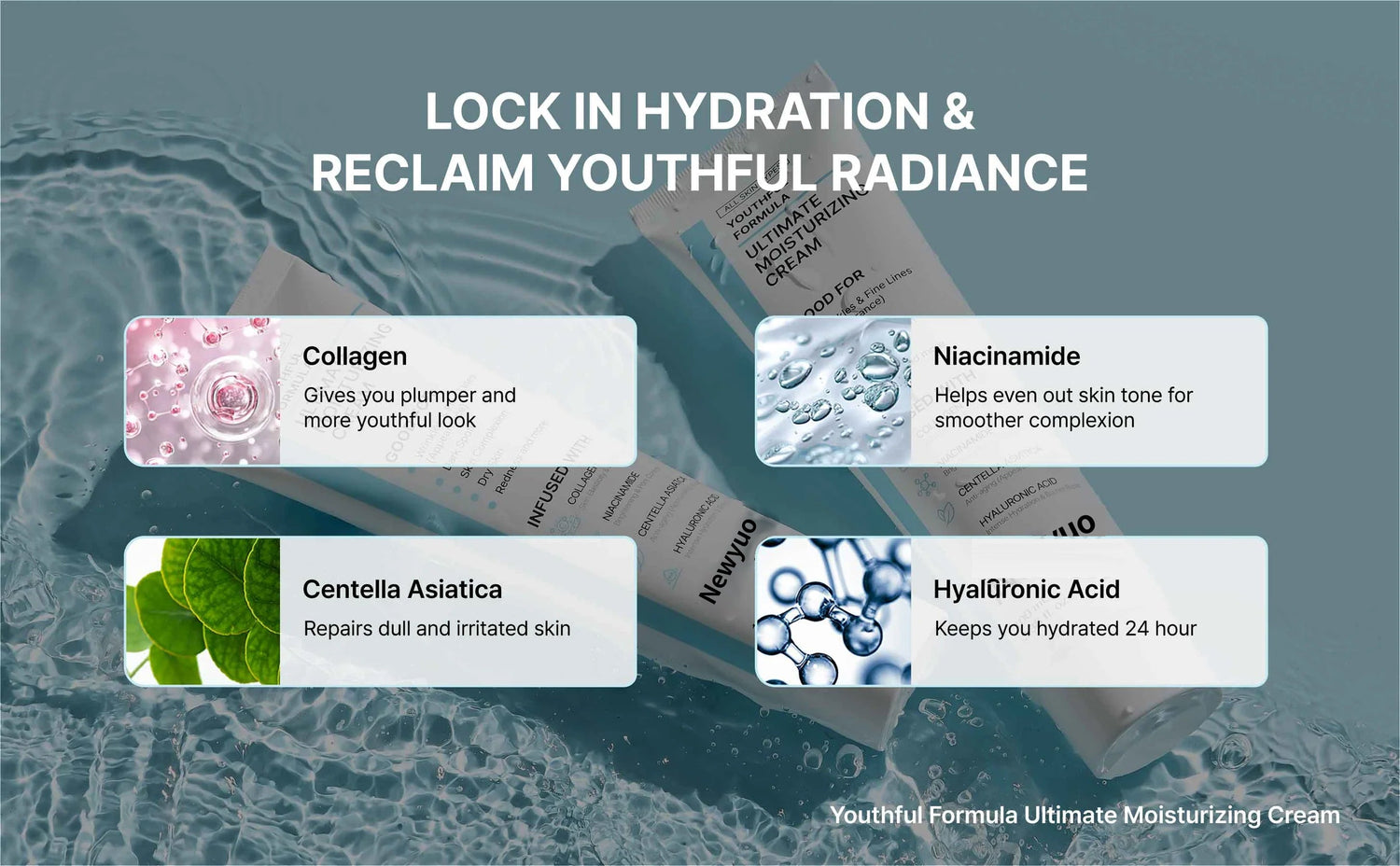 Most moisturizers only hydrate the surface. Newyuo™ works deeper — using collagen, niacinamide, hyaluronic acid, and centella asiatica to repair your skin barrier, boost elasticity, and lock in moisture for 24 hours. You’ll see and feel the difference in texture, tone, and lasting comfort.